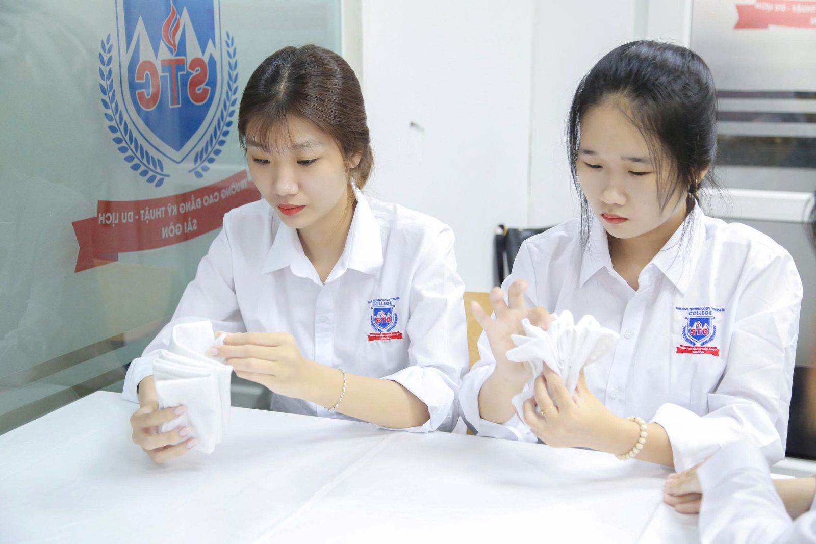 Một trong những kỹ năng cơ bản nhưng vô cùng quan trọng trong lĩnh vực nhà hàng khách sạn chính là nghệ thuật gấp khăn. Tại STC, sinh viên được trực tiếp rèn luyện qua những giờ thực hành sinh động: từ cách gấp khăn đơn giản đến những kiểu dáng phức tạp, đòi hỏi sự tỉ mỉ và sáng tạo.